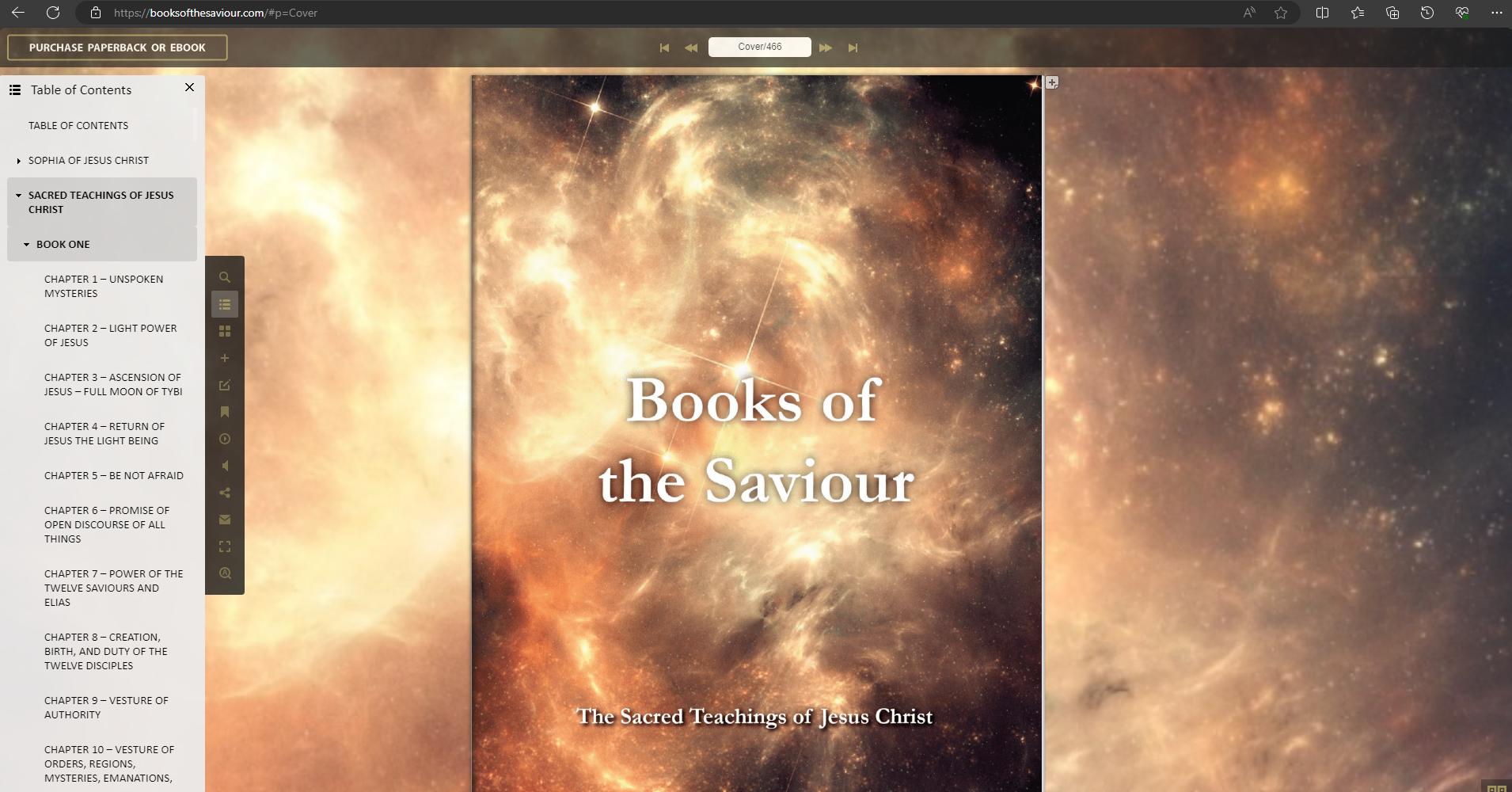 Books of the Saviour is a compilation of Jesus' secret teachings of the kingdom of Heaven, the creation of mankind, the commandments of Jesus, and the mysteries that allow our ascendance. The books also include Jesus' teachings about the baptisms that are to be performed and the signs we are to provide, if we are to ascend, the reincarnation process, the destruction of the soul, and the process of how one can escape the outer darkness (hell or the Amente of Chaos).